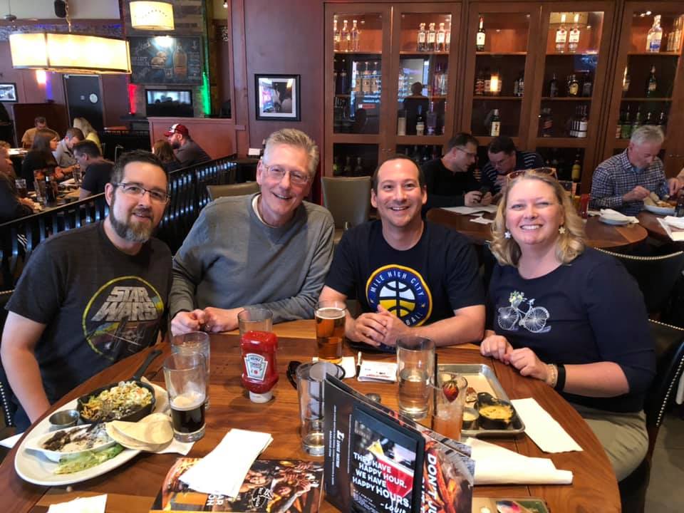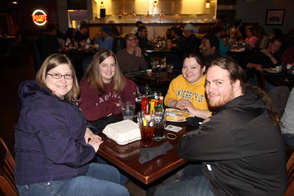 Four people smiling at a table in a busy restaurant, enjoying a trivia night with meals in front of them.