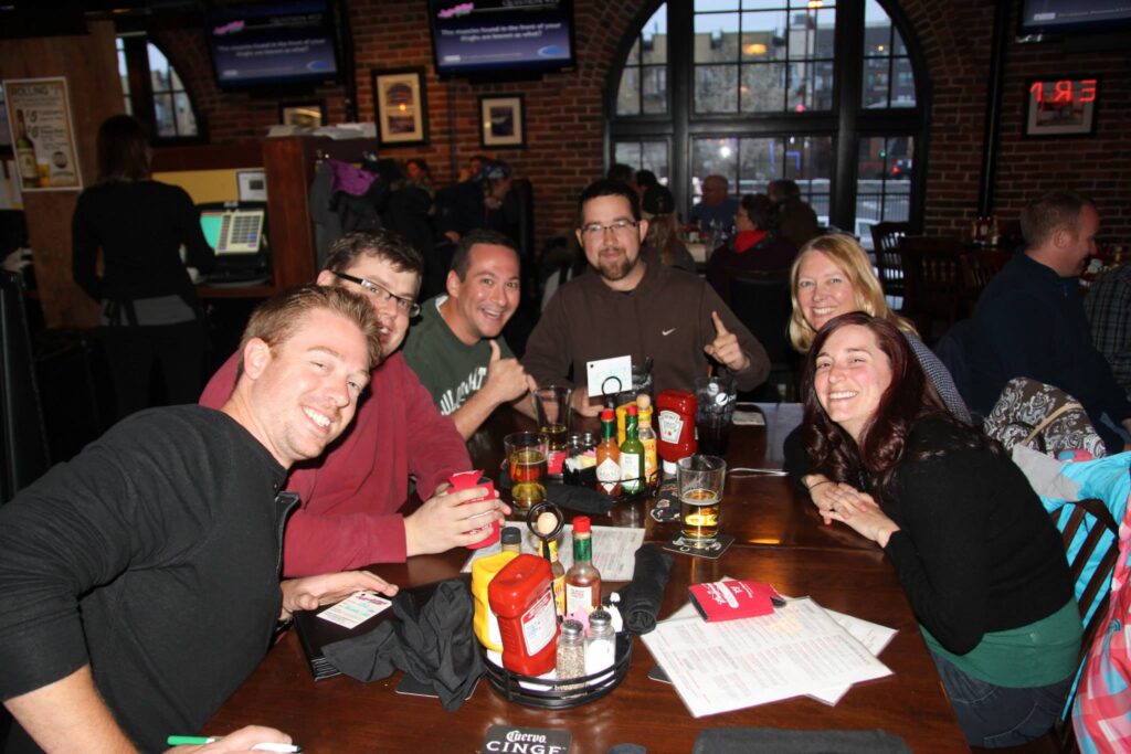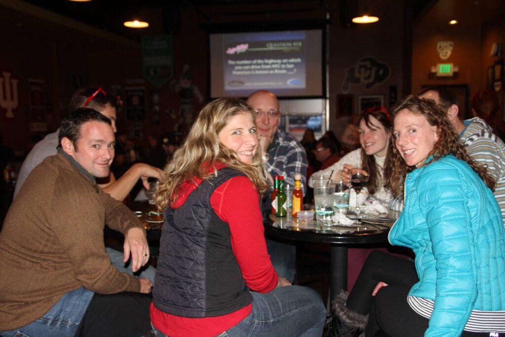 Group of people sitting at a bar with drinks, participating in pub trivia, smiling at the camera; bar signage and TV screens are visible in the background.