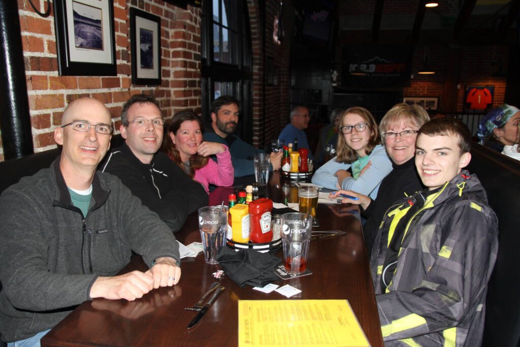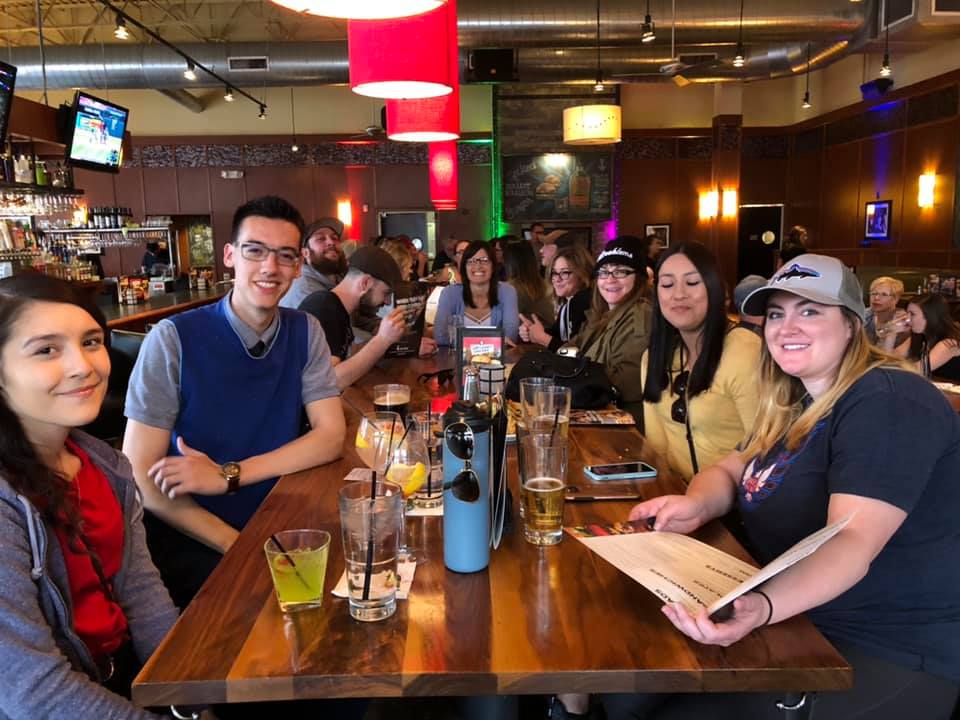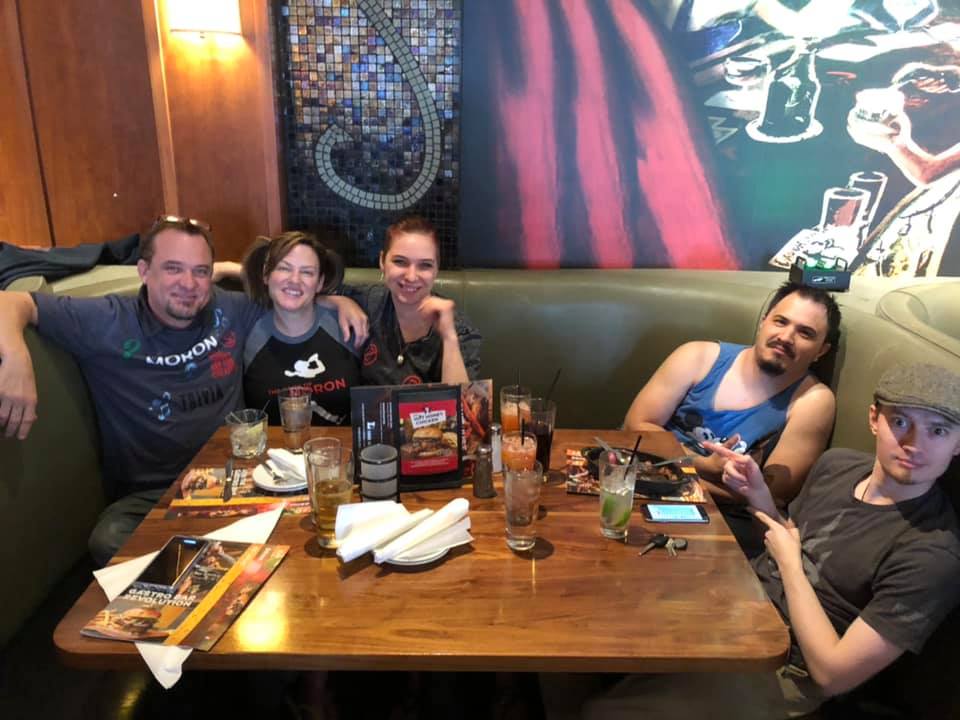 Seven people smiling around a restaurant table filled with food, in a warmly lit room with artworks on the walls during a DJ trivia night.
