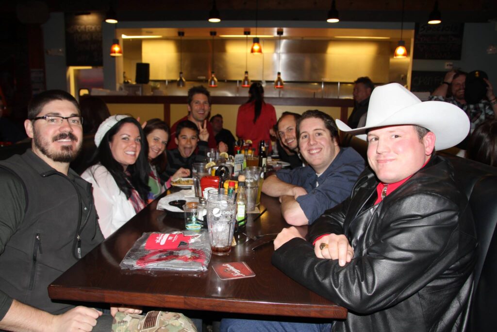 A group of people smiling around a dinner table in a restaurant, with one man wearing a white cowboy hat. Glasses and beverages are visible on the table as they enjoy a DJ trivia night.