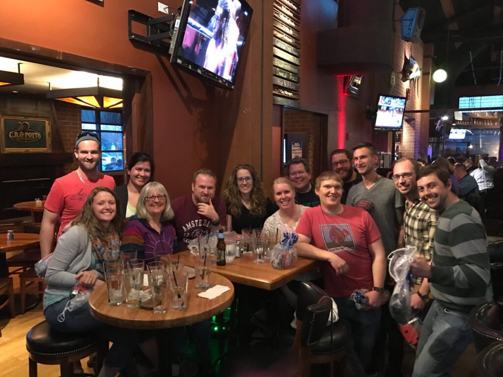 Group of friends smiling at a bar table with empty glasses, enjoying a casual trivia night gathering.