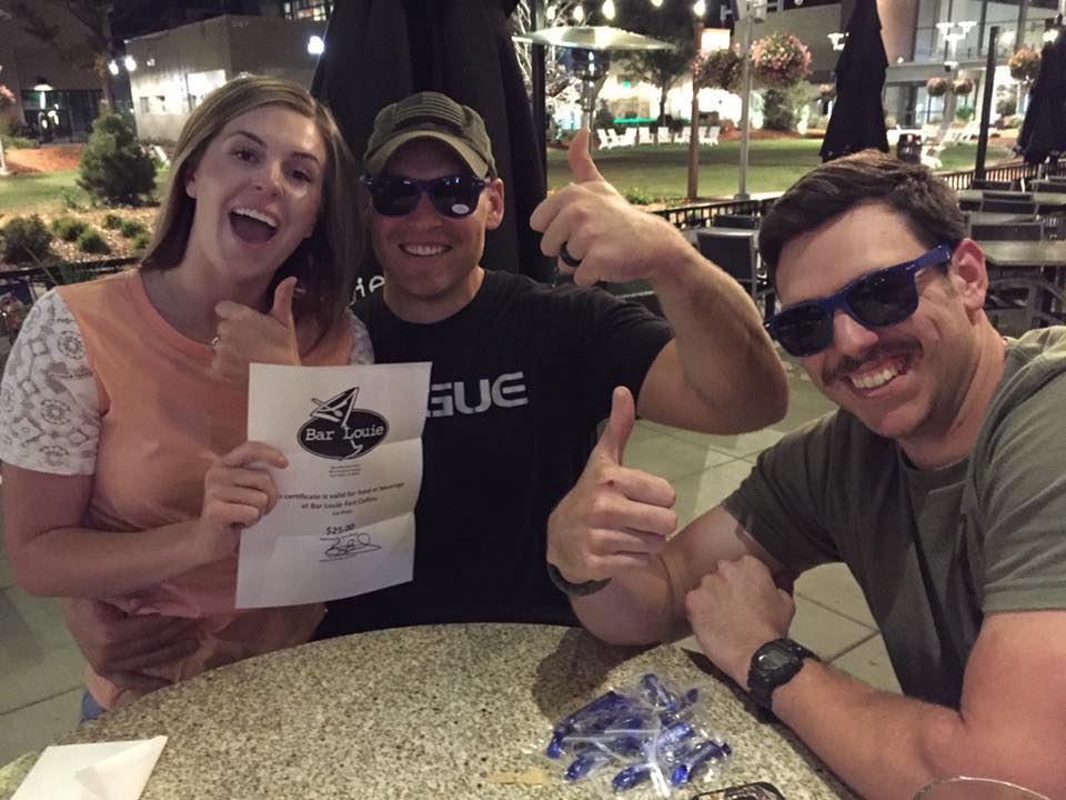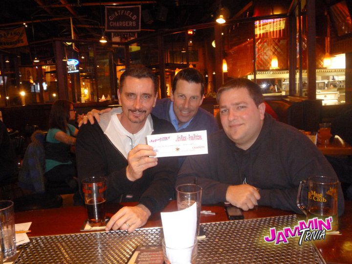 Three men smiling at a table in a bar, holding a DJ trivia night prize certificate, with the venue bustling in the background.