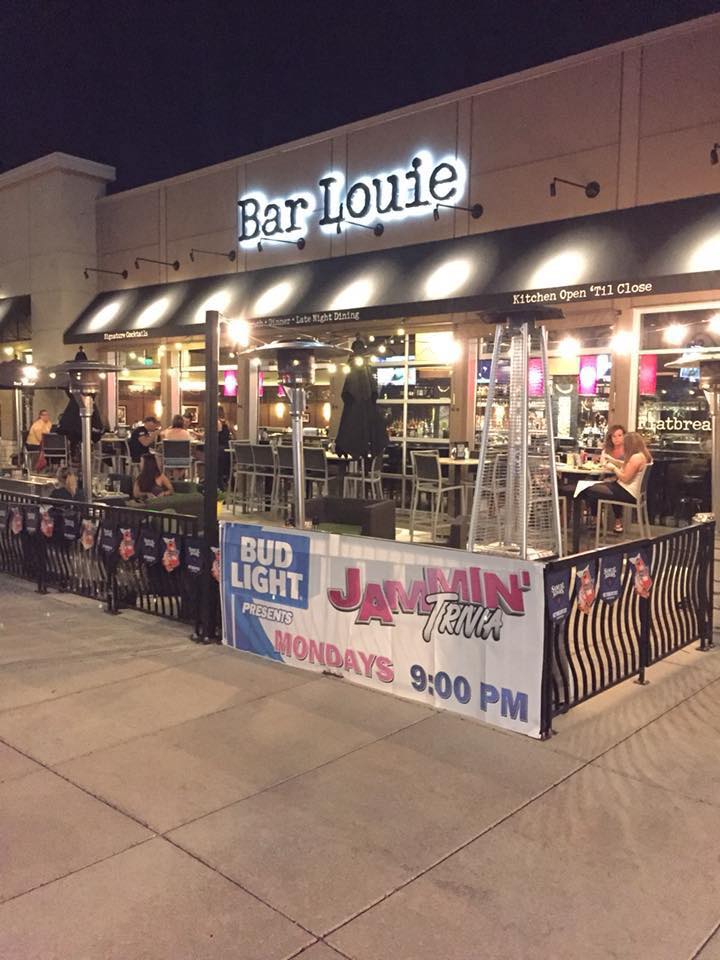 Exterior of Bar Louie at night featuring outdoor seating with patrons and promotional banners for trivia events.