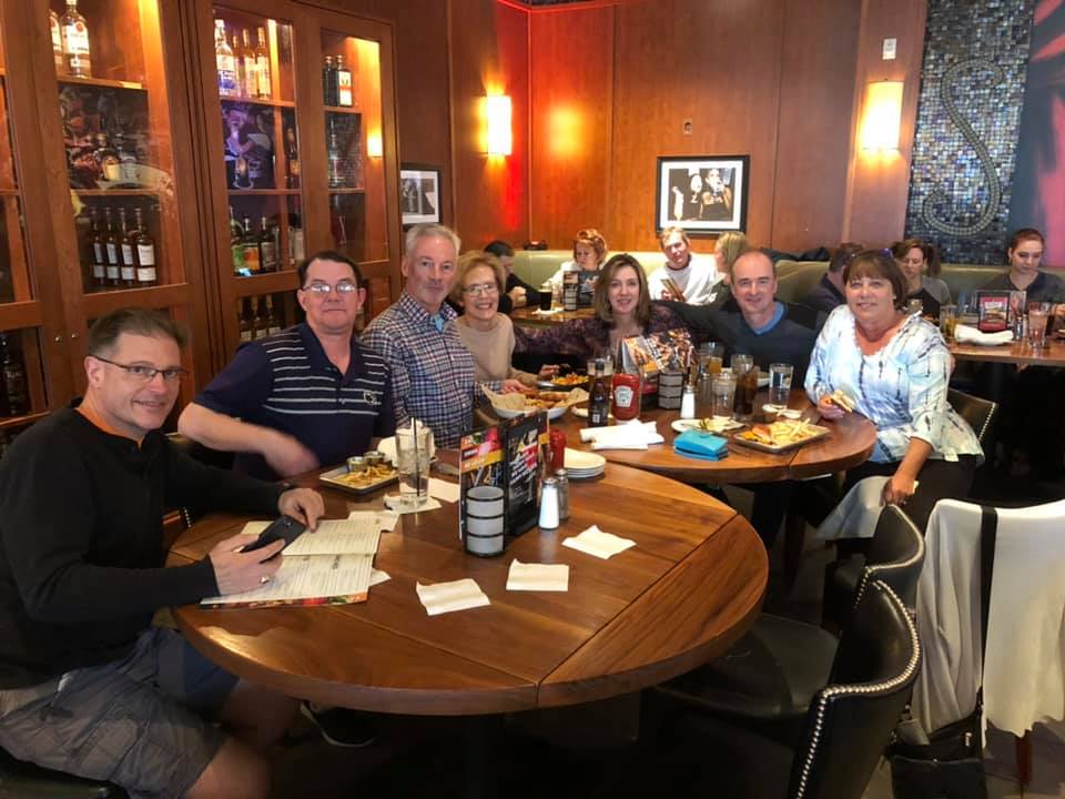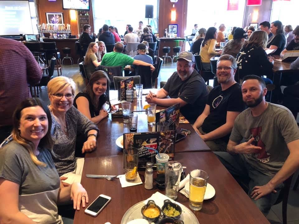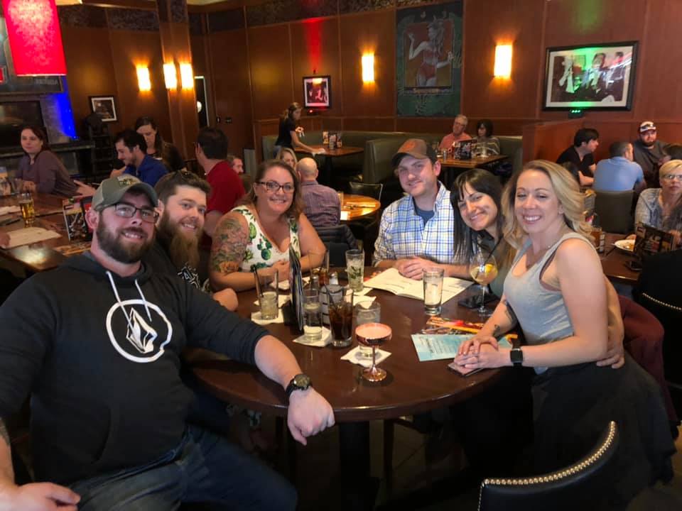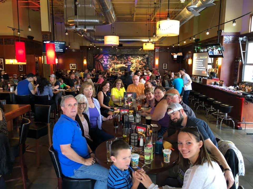 Group of six adults smiling at a table in a restaurant with drinks, in a lively atmosphere with trivia on the TV in the background.