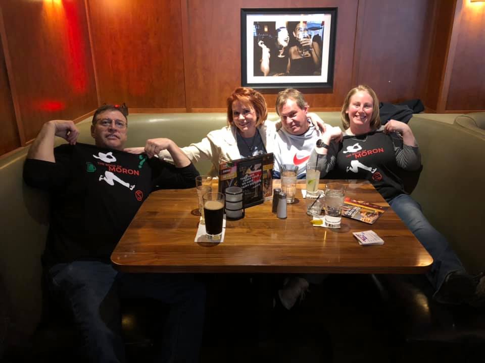 Four adults in matching "moron" t-shirts pose happily around a pub table with drinks, food, and a photo of a couple on the wall behind them during a DJ trivia night.