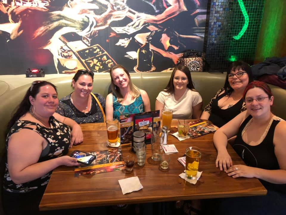 Six women smiling at a table in a bar with drinks and menus, a colorful mural on the wall behind them, enjoying a DJ trivia night hosted by a popular trivia company.