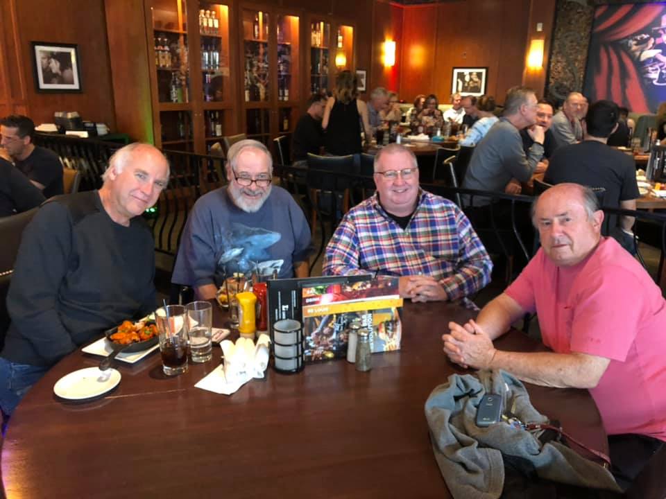 Four elderly men enjoying a meal together at a pub trivia night.