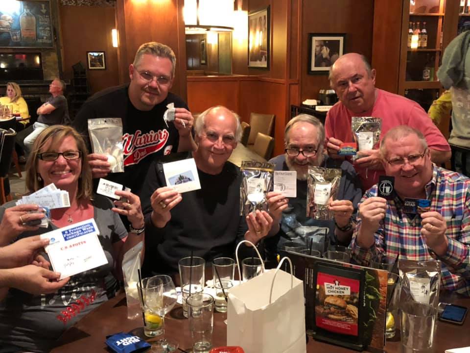 Group of six adults celebrating with drinks and showing off playing cards and other small items at a table during pub trivia in a restaurant.