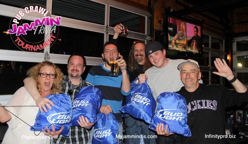 Group of seven adults smiling and posing at a pub trivia night event in a bar, holding Bud Light merchandise and beer bottles, with event logos displayed.